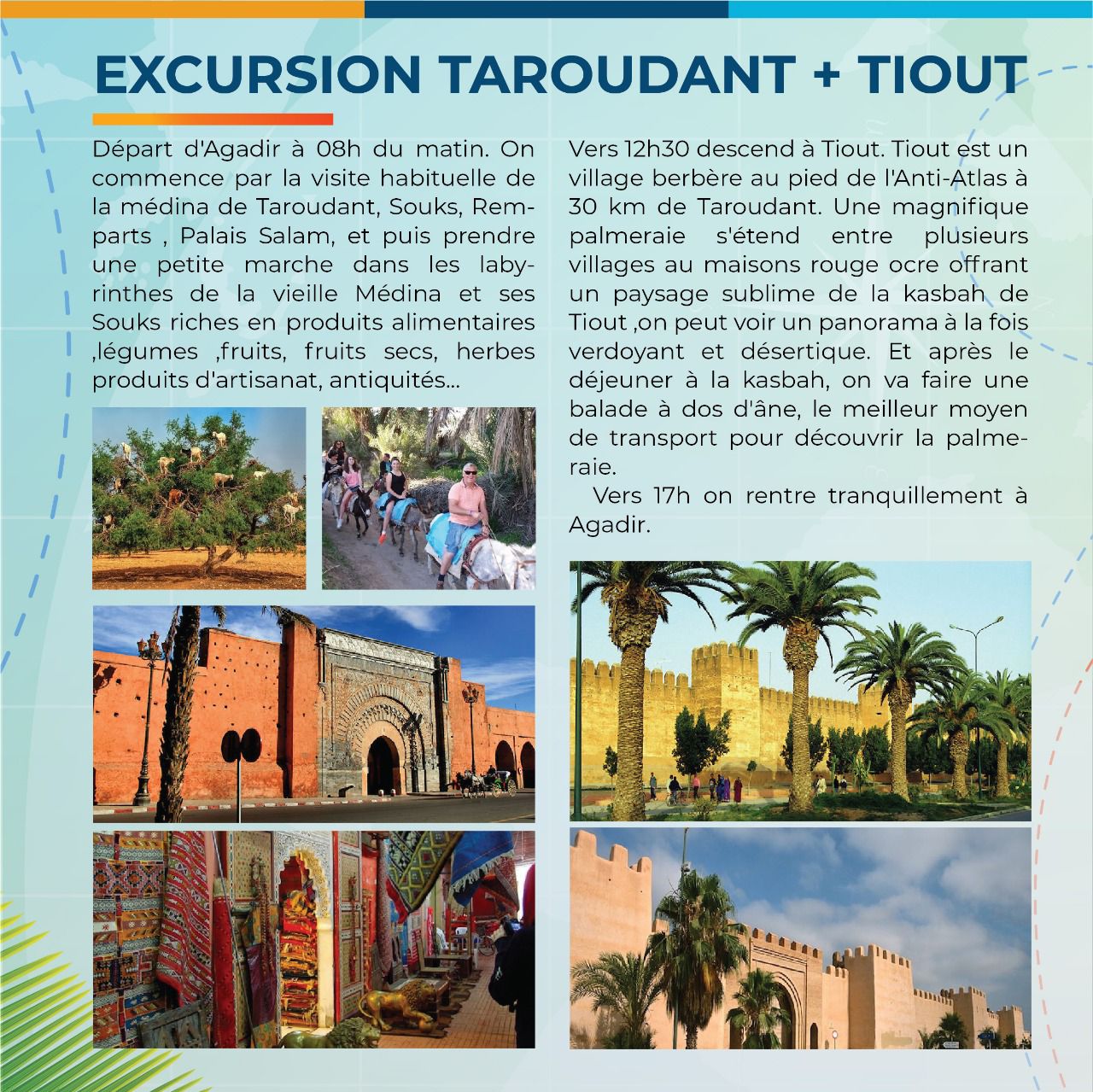 👉 Réservez dès maintenant votre excursion à Taroudant et Tiout avec Mouja Tours et partez à la découverte de la culture, des paysages et des traditions marocaines pour une journée inoubliable.